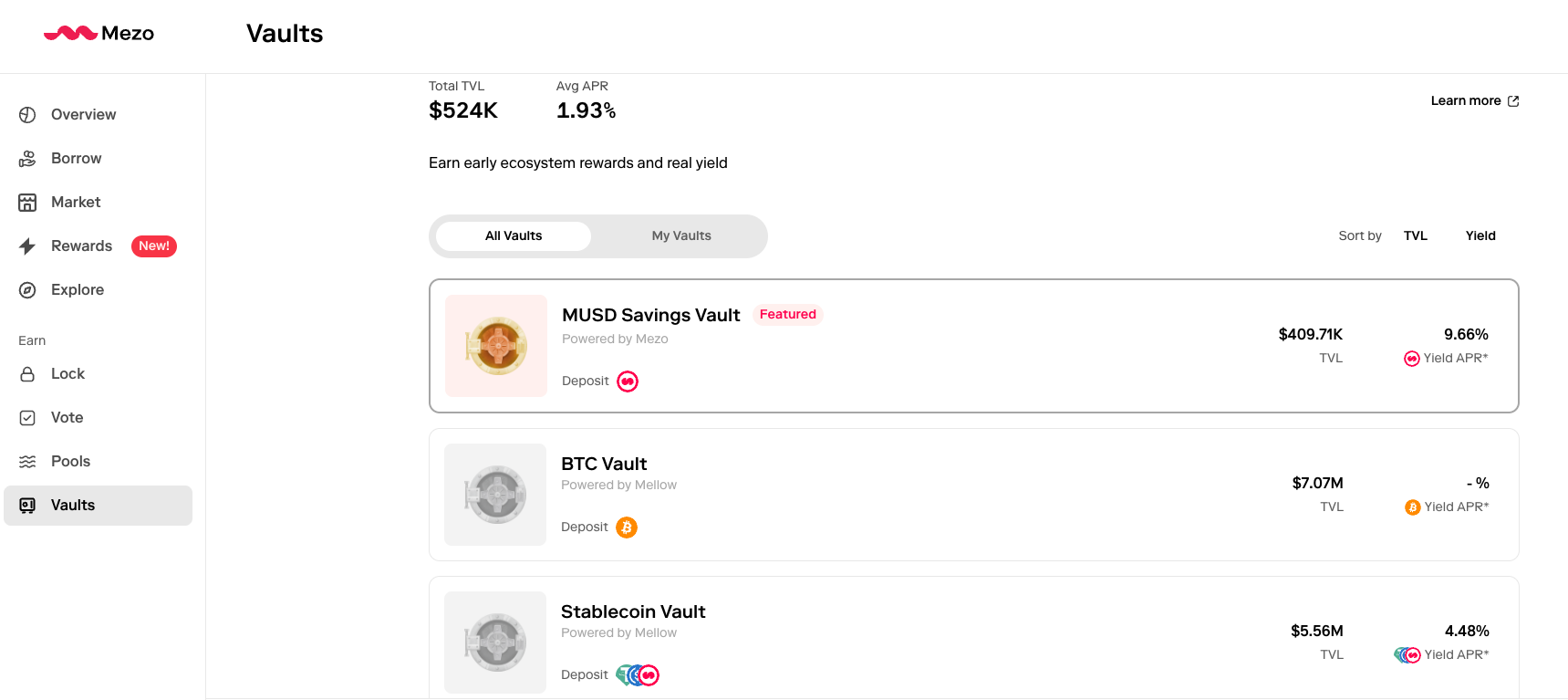 Head to mezo.org/earn/vaults to view both vaults, review strategies, and deposit. Connect your wallet, select your asset, and choose your vault. Deposits are open now.