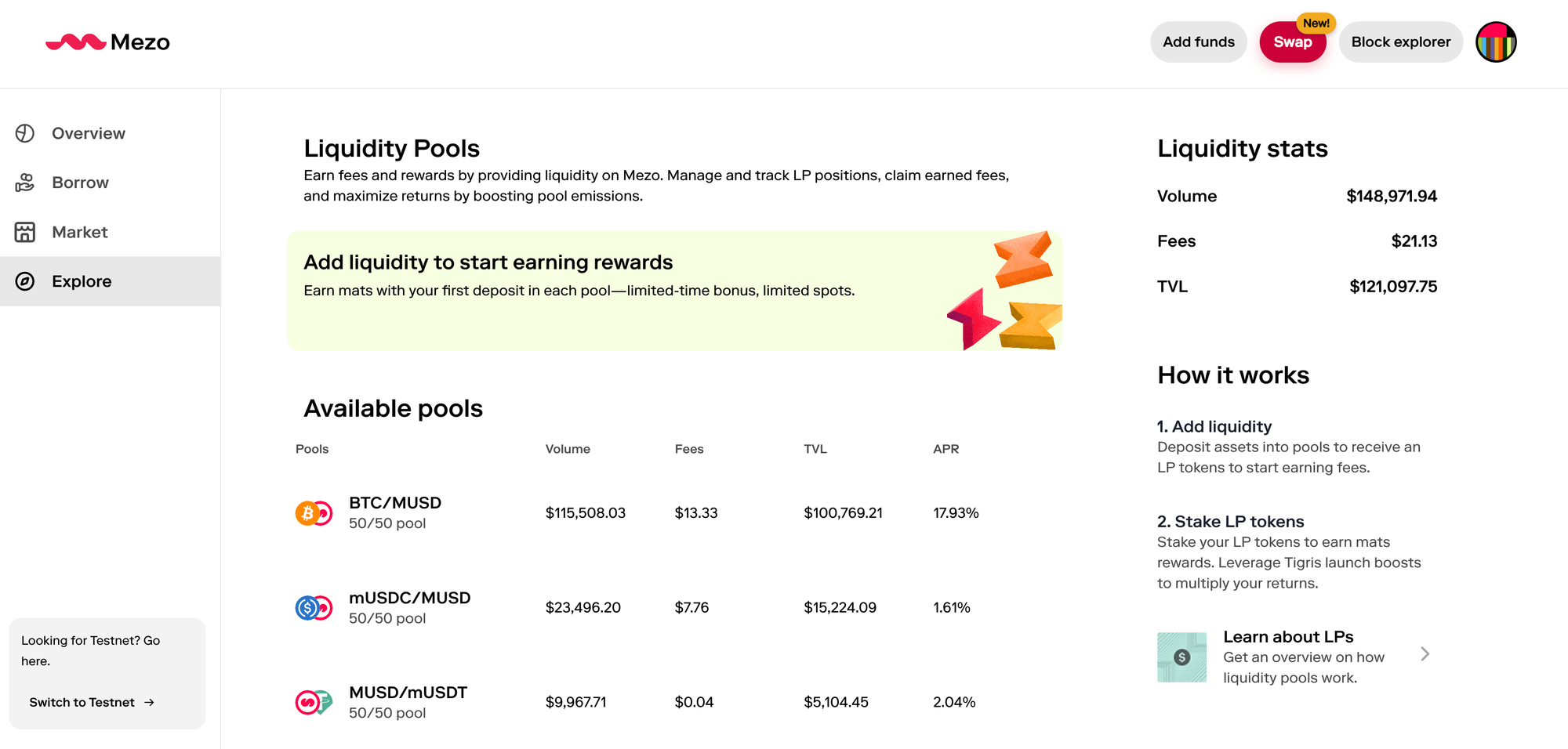 - Add Liquidity: Navigate to the Pools page on Mezo Explore. Select your desired pool, specify the amount you wish to deposit, and confirm the transaction. You will receive LP tokens in your wallet, representing your share of the pool.